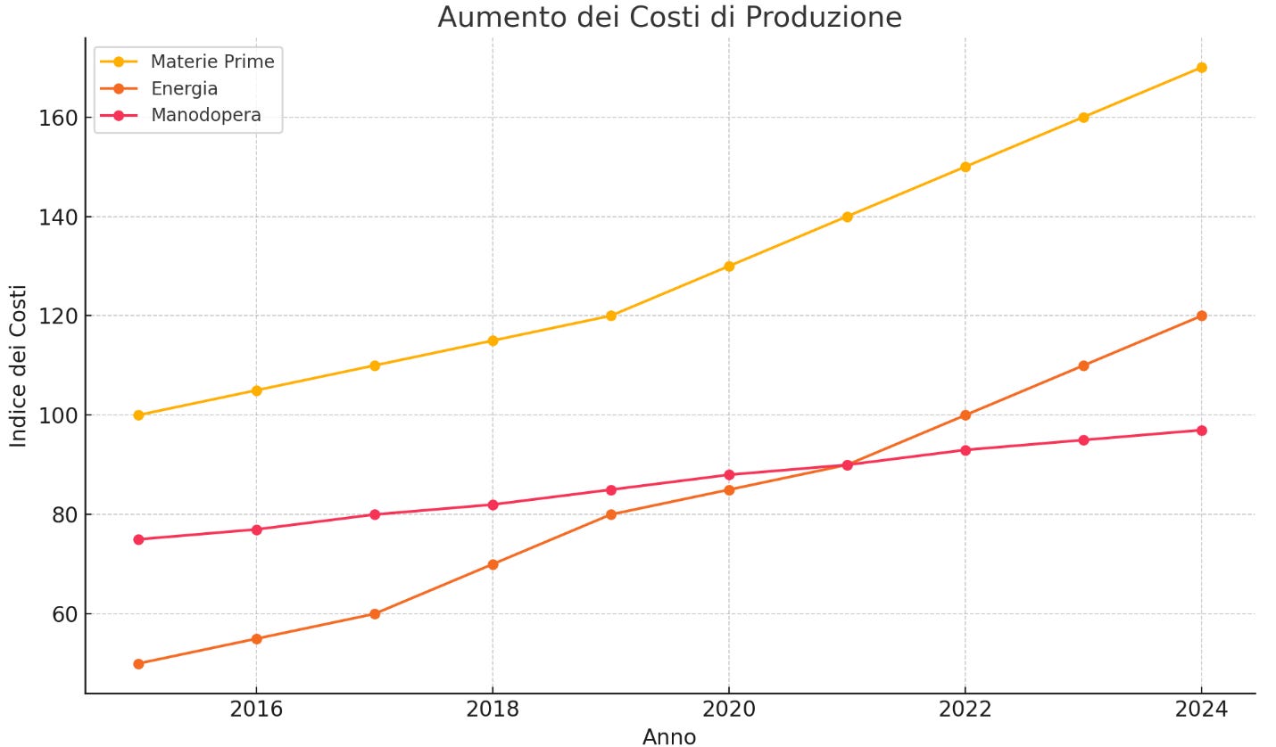 Figura 2: Aumento dei costi di produzione dal 2015 al 2023, suddiviso per materie prime, energia e manodopera.