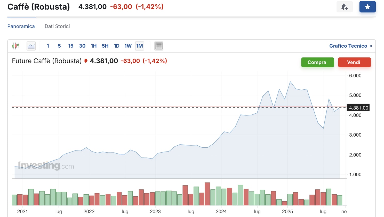 La varietà robusta, quella che le grandi catene adorano per i margini che promette, ha fatto registrare rialzi ancora più drammatici: da $1.200 per tonnellata a oltre $4.300. L’ultimo anno ha visto l’arabica crescere del 65,8%, un balzo che travolge qualsiasi business plan scritto con ottimismo.